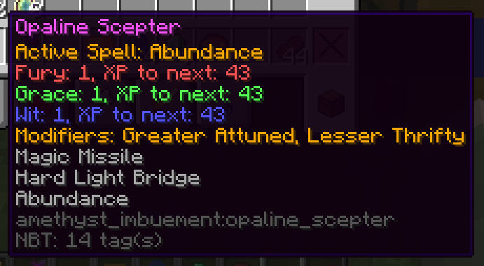 Включен фреймворк для создания широкого спектра скипетров в стиле Amethyst Imbuement — от самого базового AbstractScepterItem, с которым можно пойти почти в любом направлении, до DefaultScepterItem, который почти полностью реализован для создания собственного совместимого с Amethyst Imbuement скипетра (или скипетров).