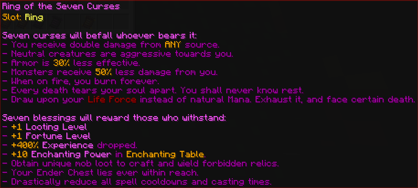 Covenant of the Seven Curses — это мод для версии 1.20.1, интегрирующий Blood Magic, Enigmatic Legacy и Iron's Spells 'n Spellbooks. Вдохновленный аддоном Tome of Blood для Ars Nouveau, этот аддон предоставляет магам возможность использовать темную сторону заклинаний и призывать их, используя свою собственную Сущность Жизни (Life Essence).
