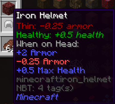 Наборы снаряжения поддерживают Атрибуты, включая пользовательские атрибуты, и Модификаторы Снаряжения. В настоящее время только атрибуты могут быть добавлены строго через датапак, модификаторы должны быть созданы в коде перед ссылкой на них в наборе снаряжения. Где-то в моем списке "хочу сделать" — модификаторы снаряжения на основе датапаков, так что следите за обновлениями!