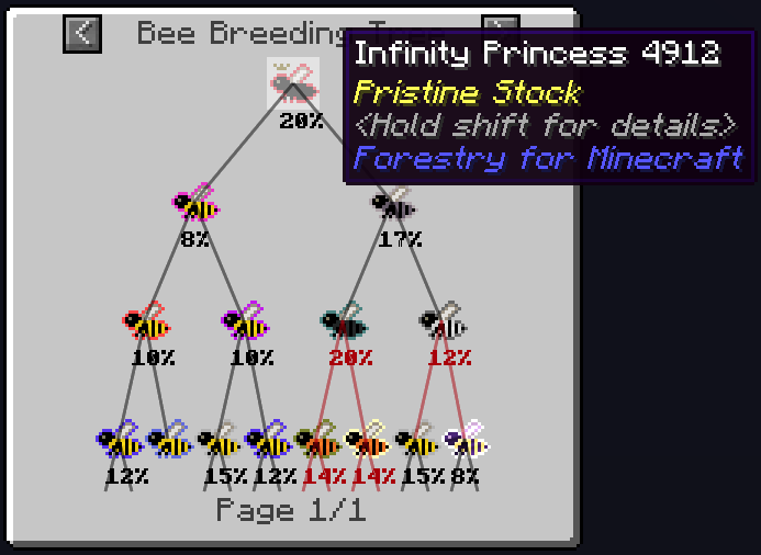 Этот мод добавляет более понятное руководство по разведению пчел в форме деревьев разведения в NEI (1.7.10)/ JEI (1.12.2), чтобы оказать некоторую поддержку в выведении желаемых пород пчел.