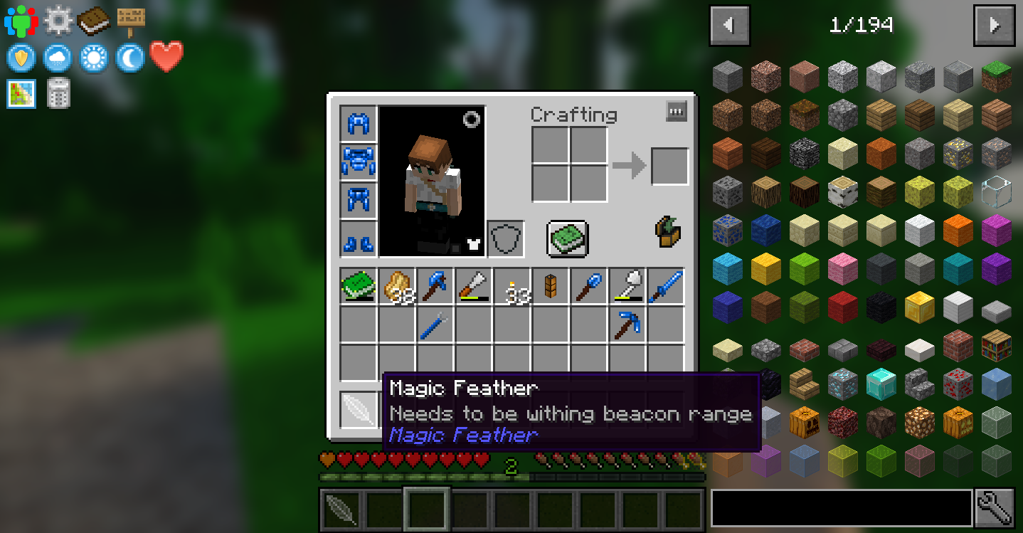 Он добавляет перо, которое предоставляет игроку творческий полёт, пока он находится в радиусе действия активного ванильного маяка.
