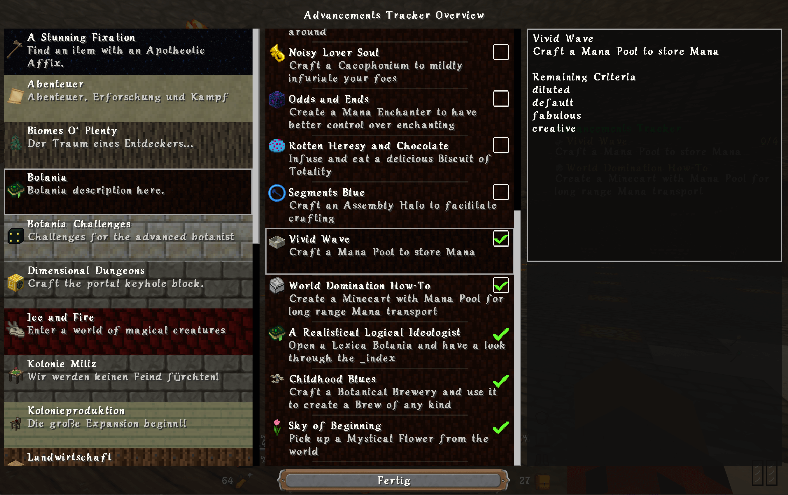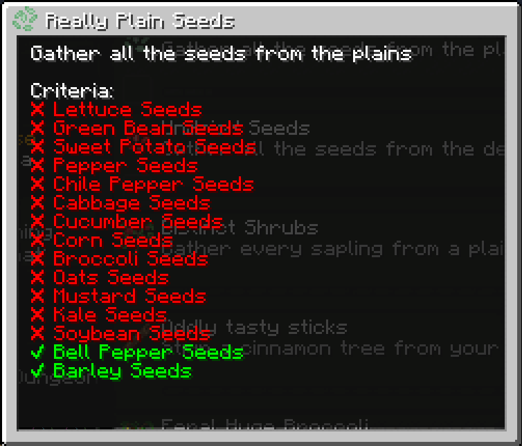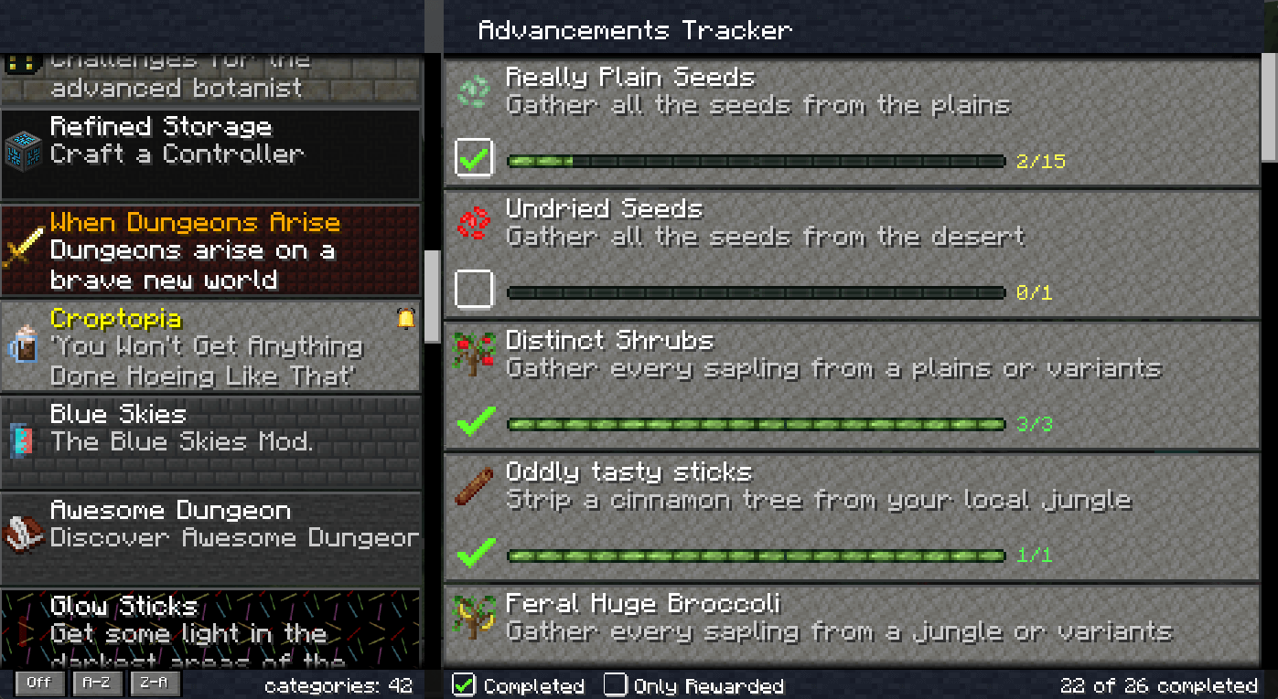 Этот мод добавляет поддержку перевода критериев вместо использования загадочных требований, таких как 1, 2, 3. Переведенный текст добавляется через языковые файлы, и вы увидите соответствующее сообщение в логе клиента для непереведенных достижений, например: Unable to translate summoned (advancement.minecraft.nether.summon_wither.summoned) to a more meaningful name.