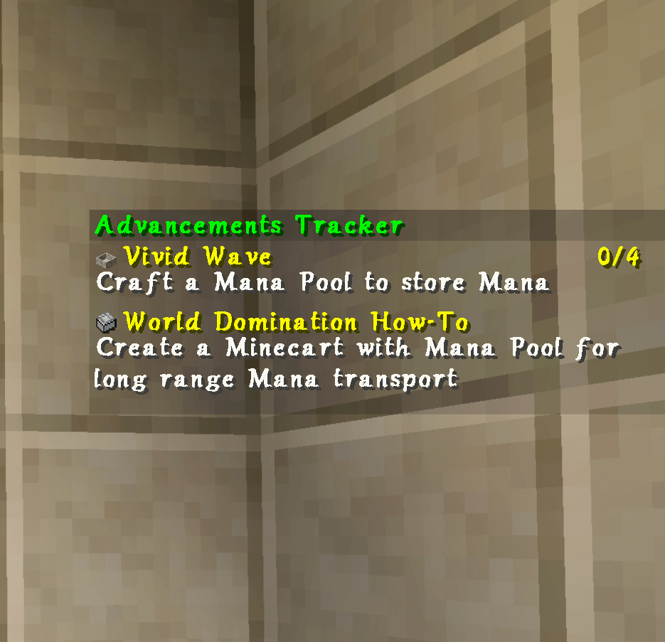 Вы можете определить отслеживаемые достижения через файл настроек, которые должны отображаться по умолчанию в определенном порядке. Это полезно для сборок модов, чтобы пользователь сначала получал обучающие достижения/задачи, а затем другие предопределенные задачи. Если вы определяете предустановленный порядок, вы можете отключить экран обзора, чтобы убедиться, что пользователь случайно не прекратил их отслеживание.
