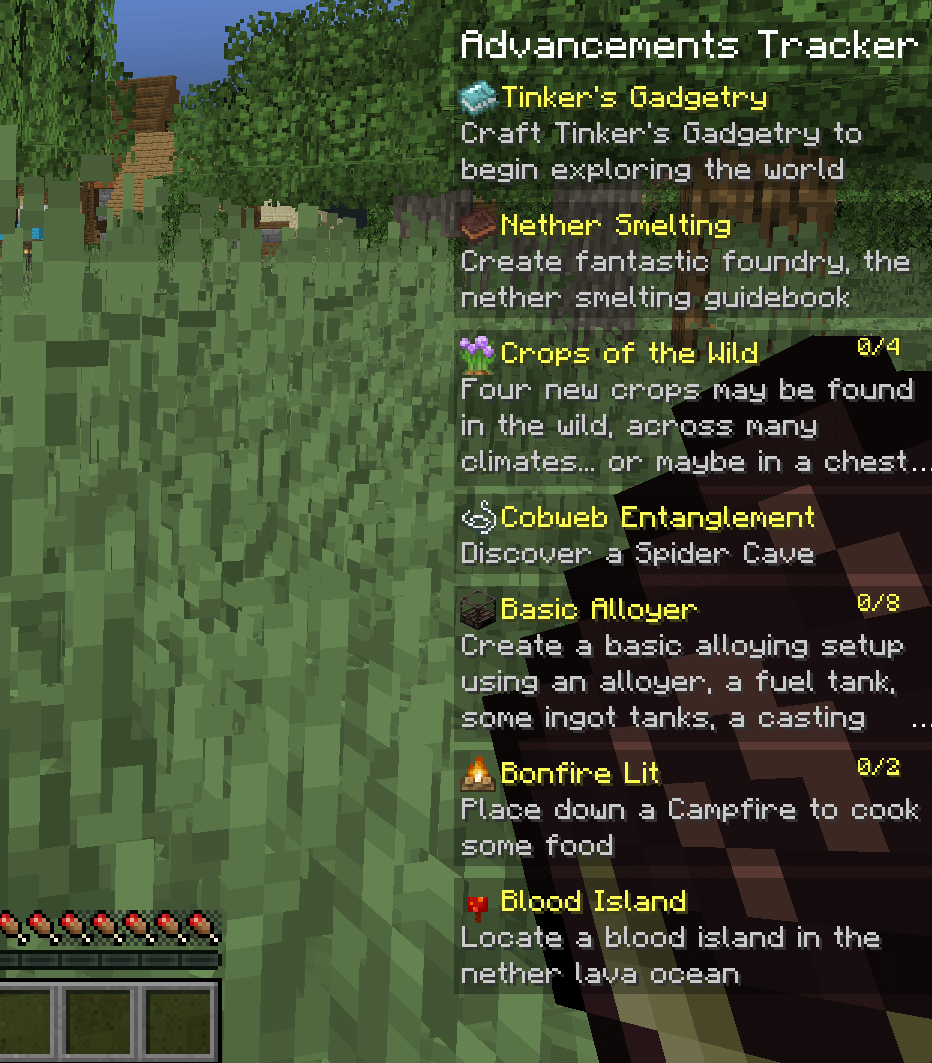 Advancements Tracker — это мощный клиентский мод для Minecraft Forge, который улучшает ваш игровой опыт, предоставляя интуитивно понятный оверлей. Этот оверлей позволяет вам легко отслеживать прогресс в выполнении выбранных достижений, делая процесс более плавным и приятным.