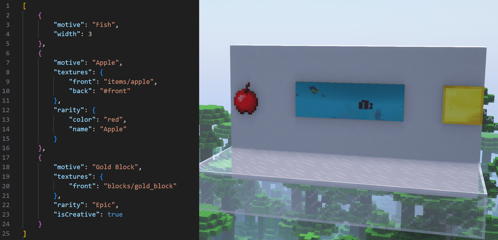 - Может переопределять картины! Это можно использовать, например, чтобы дать некоторым ванильным картинам пользовательские текстуры задней или боковой сторон, которые соответствуют передней.
