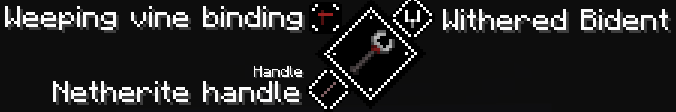 Withered Bident — это оружие, полученное в результате объединения ужасной тёмной магии внутри черепа визер-скелета и силы, заключённой в трезубце. Оно предлагает чрезвычайно высокий шанс критического удара и лучше всего используется на дальних дистанциях. В игре текстура анимирована и включает в себя душу, заточённую внутри Биденса. Вы монстр.