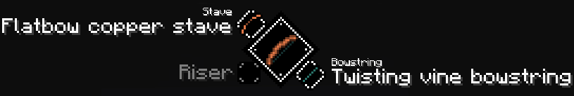 Плечо плоского лука (Flatbow stave): Новый чертёж для луков, основанный на реальных плоских луках. Требуется много времени для натяжения, но даёт хороший бонус к скорости стрелы при полном натяжении. Отлично подходит для поражения целей на дальних дистанциях, когда вы не торопитесь.