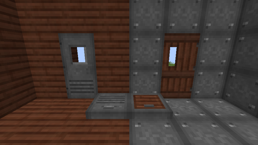 - Стальные двери и люки по умолчанию активируются только редстоуном, но в настройках их можно сделать открываемыми и вручную. Стальные двери с ручным управлением работают с функцией открывания двойных дверей из мода Quark, если он установлен и эта функция включена (обычно Quark не делает этого для металлических дверей).