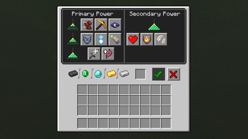• Добавляет ночное зрение, сопротивление огню, питание, длинную руку и медленное падение в качестве эффектов маяка