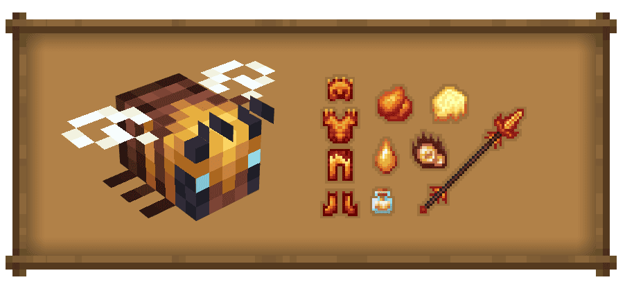 - Используйте полный комплект карамельной брони, чтобы получить для приручённой пчелы следующие бонусы: сопротивление огню, 20 HP, игнорирование 40% урона, высокий уровень силы