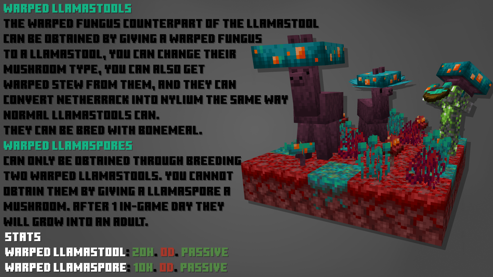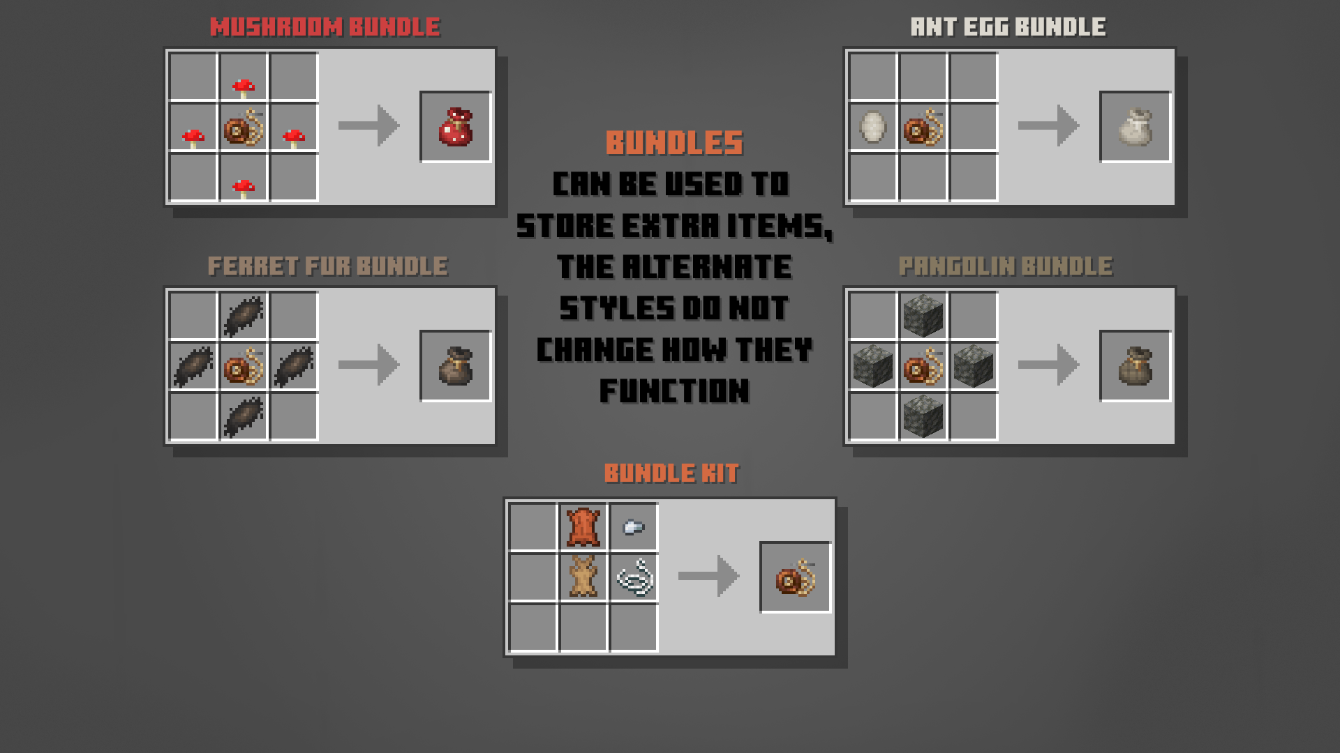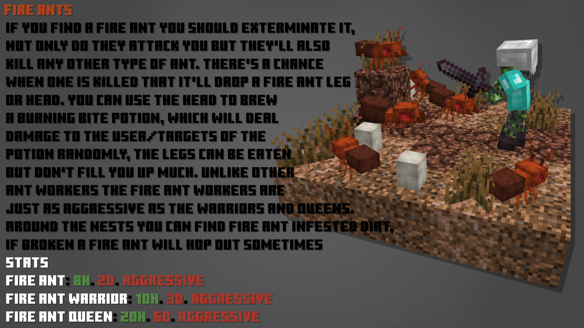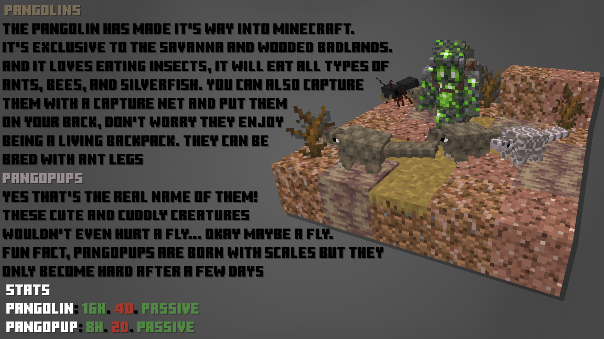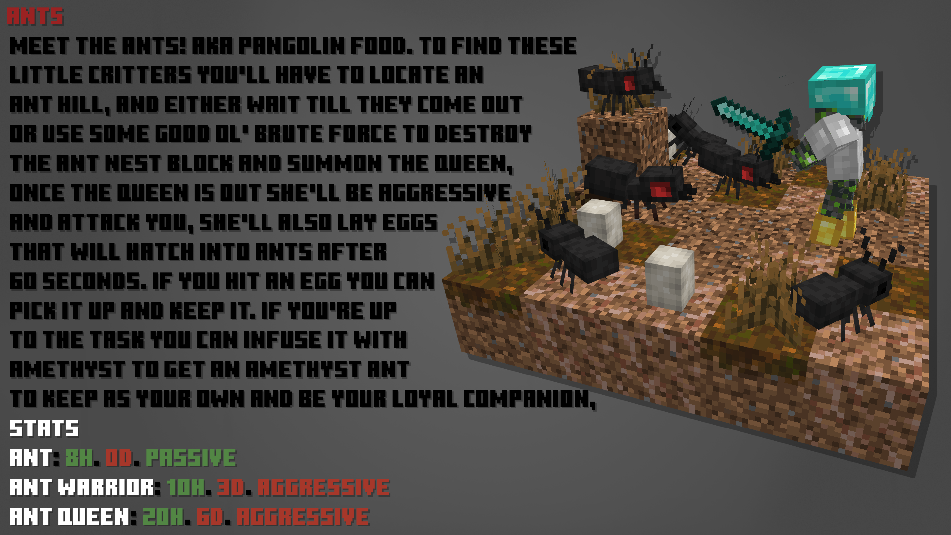 В Minecraft недостаточно питомцев, но это скоро изменится. Теперь вы можете найти Хорьков, Панголинов, Муравьёв, Nigriceps Ants, Огненных муравьёв и Llamastools. Также доступны Аметистовые муравьи и Trufflespores. У каждого моба есть уникальные механики, которые подробно описаны во вкладке с изображениями. На данный момент предметы в этом моде, кажется, имеют лишь одно применение и не связывают мобов должным образом, но в следующем обновлении это изменится — появятся множество интересных функций и новых мобов в каждом обновлении.
