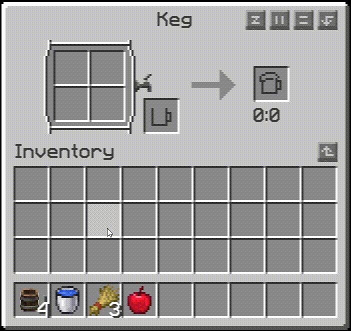 1. Приготовьте пивную бочку (keg) и как минимум 4 пустые пивные кружки, откройте меню варки, нажав ПКМ по блоку бочки.