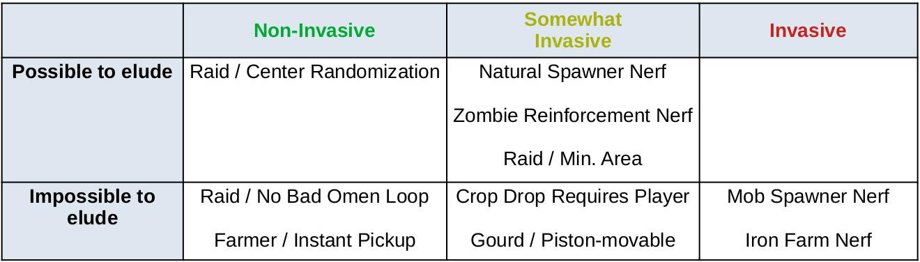 Эти два значения регулируют степень рандомизации позиции центра рейда, что мешает фермам рейдов с одной маленькой платформой для спавна. Хотя значения по умолчанию должны приводить к сбою большинства существующих конструкций, игроки, знающие об этой рандомизации, могут перепроектировать свои фермы с её учётом. В этом случае увеличение значения raid_center_max_randomization усложнит обход контрмеры, но также снизит процент неудач.