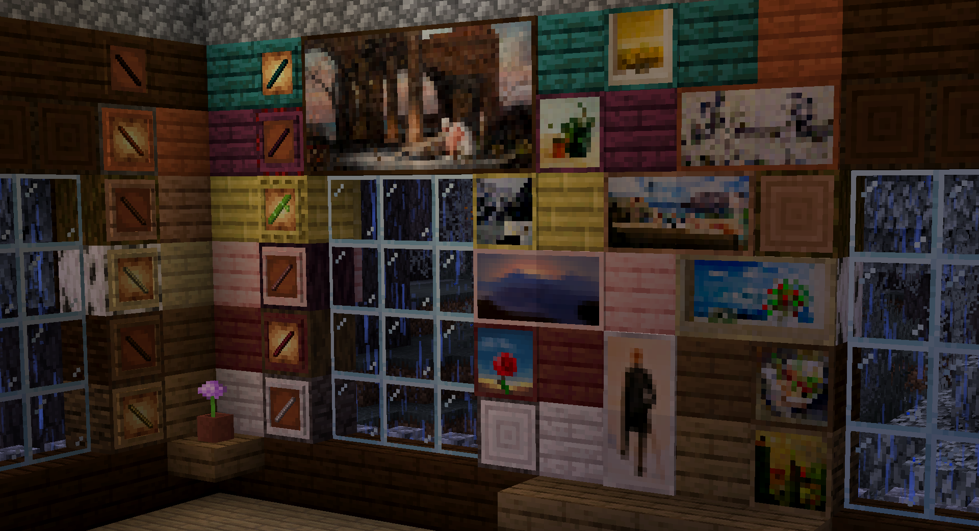 Добавляет 12 новых Картин1, 11 новых Рамок для предметов и 11 новых Светящихся Рамок для предметов в Minecraft.