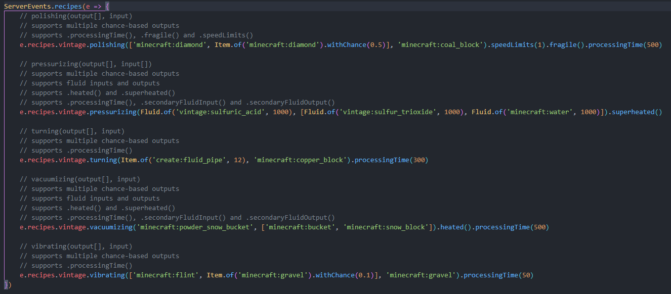 Вы можете создавать рецепты и пружины через KubeJS. Для синтаксиса, пожалуйста, обратитесь к галерее или вики.