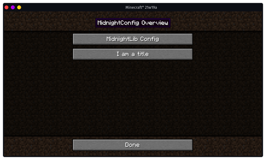 Также имеется список всех конфигураций, созданных с использованием MidnightLib, который появляется, когда ModMenu не установлен или пользователь вручную включил его.
