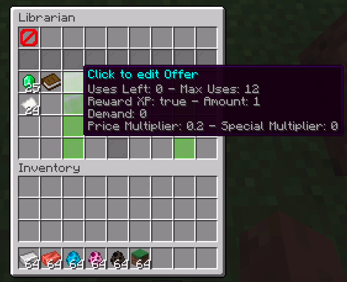 Создание пользовательских торговых предложений с жителями уже возможно в ванильной игре, но этот процесс требует активного использования очень длинных команд и не очень практичен. Кроме того, редактирование торговых предложений существующих жителей является ещё более обременительным.